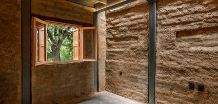 La casa responde de manera muy pasiva al contexto, cuenta con calentador solar, sistema de recolección de agua de lluvia a través de filtros, iluminación LED y paredes de adobe que te mantienen abrigado en invierno y fresco en el calor constante de la ciudad.