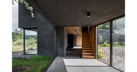 La casa surge de repensar las posibilidades de los patios. Un patio central se vuelve el corazón de la casa y estructura el acceso desde la calle, las zonas de servicio, áreas sociales y el acceso a las habitaciones, mientras que otro patio más abierto al bosque vincula las habitaciones, el estudio y las zonas privadas. Una gran terraza permite abrir el espacio social de la casa hacia el exterior, de tal manera que la sala y comedor se vuelcan al paisaje abierto en un costado y hacia el patio central en el otro.